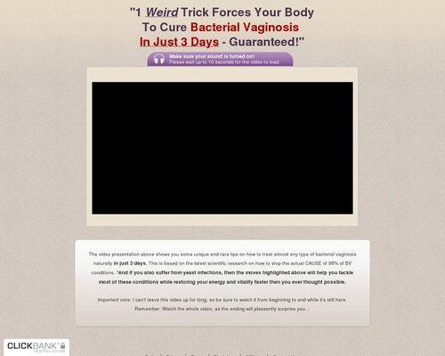 The video presentation above shows you some unique and rare tips on how to treat almost any type of bacterial vaginosis naturally in just 3 days. This is based on the latest scientific research on how to stop the actual CAUSE of 98% of BV conditions. *And if you also suffer from yeast infections, then the moves highlighted above will help you tackle most of these conditions while restoring your energy and vitality faster then you ever thought possible.