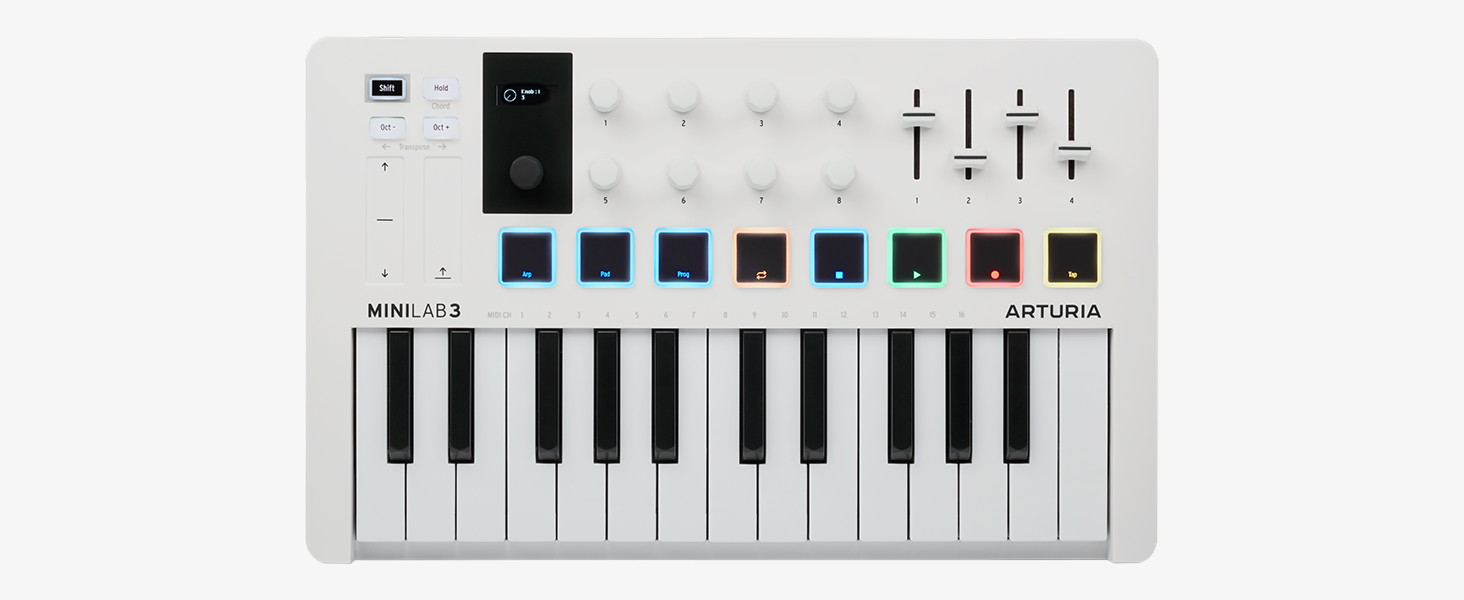 ALL THE ESSENTIAL CONTROLS IN A COMPACT CONTROLLER: MiniLab 3 is USB powered with 25 note velocity-sensitive slim keyboard, 2 banks of 8 high quality pads with RGB backlighting, 8 rotary encoders, 4 sliders, Mini display & clickable browsing knob, Built-in Arpeggiator, Hold and Chord modes, 2 touch sensors for pitch bend and modulation wheel, USB-C Port, MIDI Out. Great for beginners, it also fits for pros, and allows you to tweak every aspect of your mix in an instant.